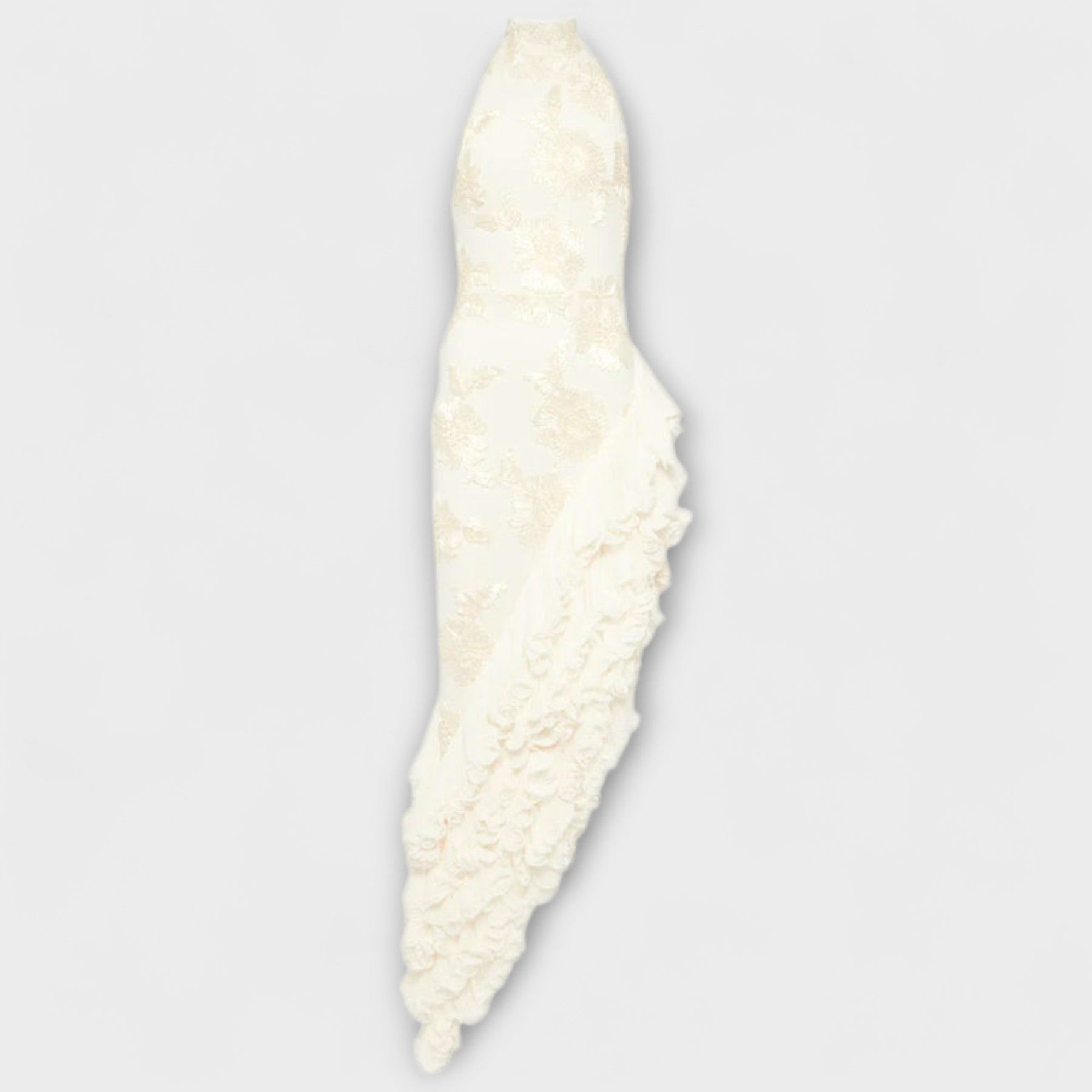 Zarte 3D-Blumenapplikationen zieren die fließende, bodenlange Silhouette und verleihen dem Kleid eine bezaubernde Leichtigkeit.