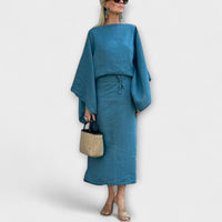 Charakteristisch sind die weiten Ärmel, der überkreuzte Ausschnitt und der passende Stoffgürtel, die eine stilvolle Balance zwischen Lässigkeit und Raffinesse schaffen. Perfekt geeignet für den Alltag, entspannte Treffen oder festliche Anlässe.