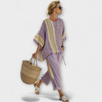 Entdecke das Faith Set, eine perfekte Fusion aus natürlicher Frische und mediterräner Ästhetik. Dieses Set, gefertigt aus leichtem Bambusleinen, präsentiert ein elegantes Design mit vertikalen Streifen, die einen handwerklichen Touch verleihen und die Figur stilisieren.